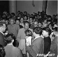 這是1956年9月27日,大會勝利閉幕,毛澤東步出會場時,受到大會代表和工作人員們的熱烈歡迎(資料照片)。